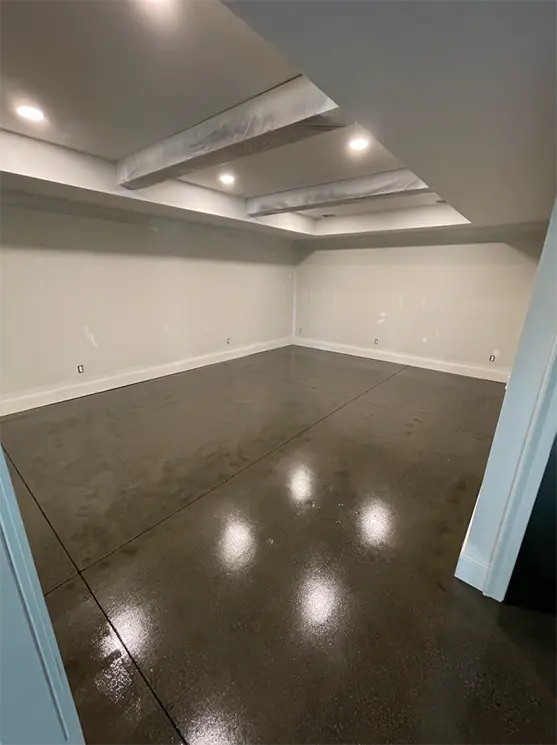 We offer a full range of concrete coating options for residential basement & patio concrete floors, including our full chip multi-layer platinum system, our semi-transparent water-based stains, our unique metallic floor coatings, and our 2-3 coat epoxy finishes in a variety of colors and sheens. The duration of install will vary depending on the coating system chosen.